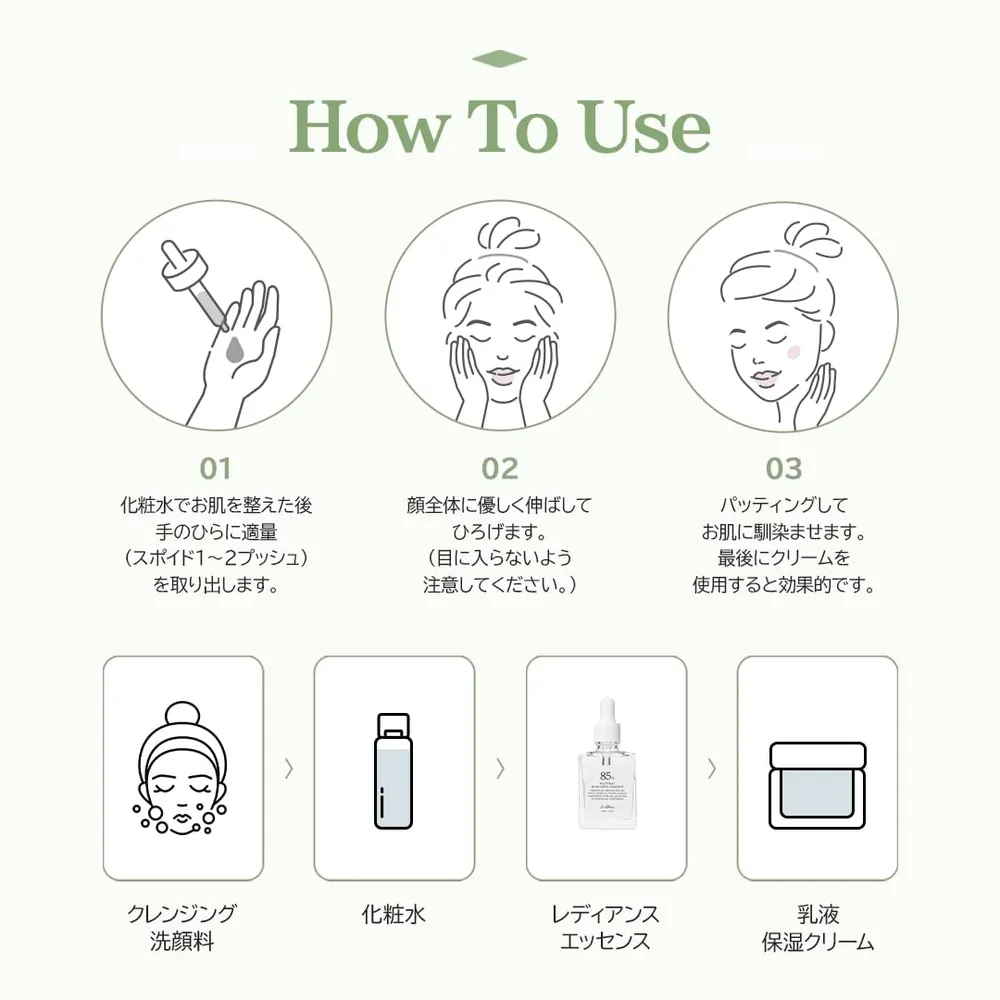 After cleansing and toning, apply a small amount evenly over the face. Pat gently until fully absorbed. Follow with serum or cream.