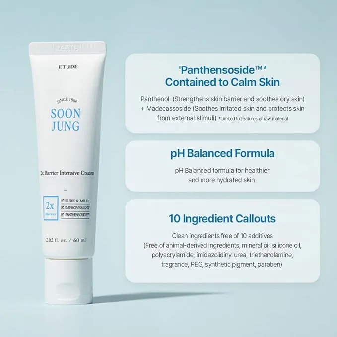 Etude SoonJung 2x Barrier Intensive Cream (60 ml) is a deeply soothing moisturizer designed to strengthen and protect sensitive skin. Formulated with Panthenol and Madecassoside, it repairs the skin barrier, locks in moisture, and restores comfort to dry, irritated skin.