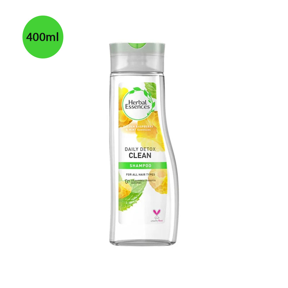 Herbal Essences Daily Detox Clean Golden Raspberry & Mint Shampoo 400ml purifies buildup, refreshes the scalp, and softens hair with Golden Raspberry, Mint, and antioxidants for clean, bouncy, healthy-looking strands.