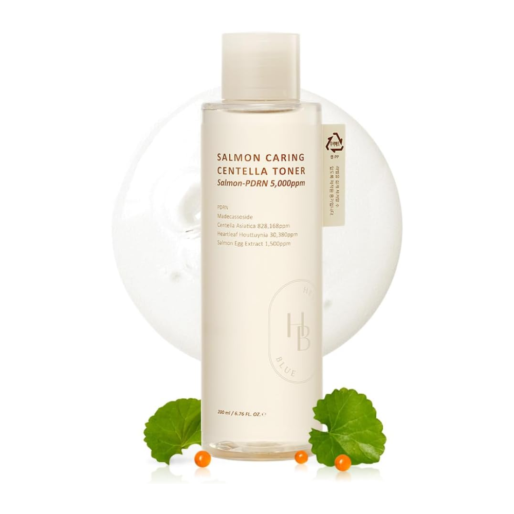 The HEVEBLUE Salmon Caring Centella Toner is a soothing and hydrating toner designed to calm sensitive skin, strengthen the moisture barrier, and refine overall texture. Because environmental stress and harsh cleansing can weaken the skin, this caring toner works to restore balance while delivering lightweight hydration. At the same time, it helps prepare the skin for better absorption of serums and creams.