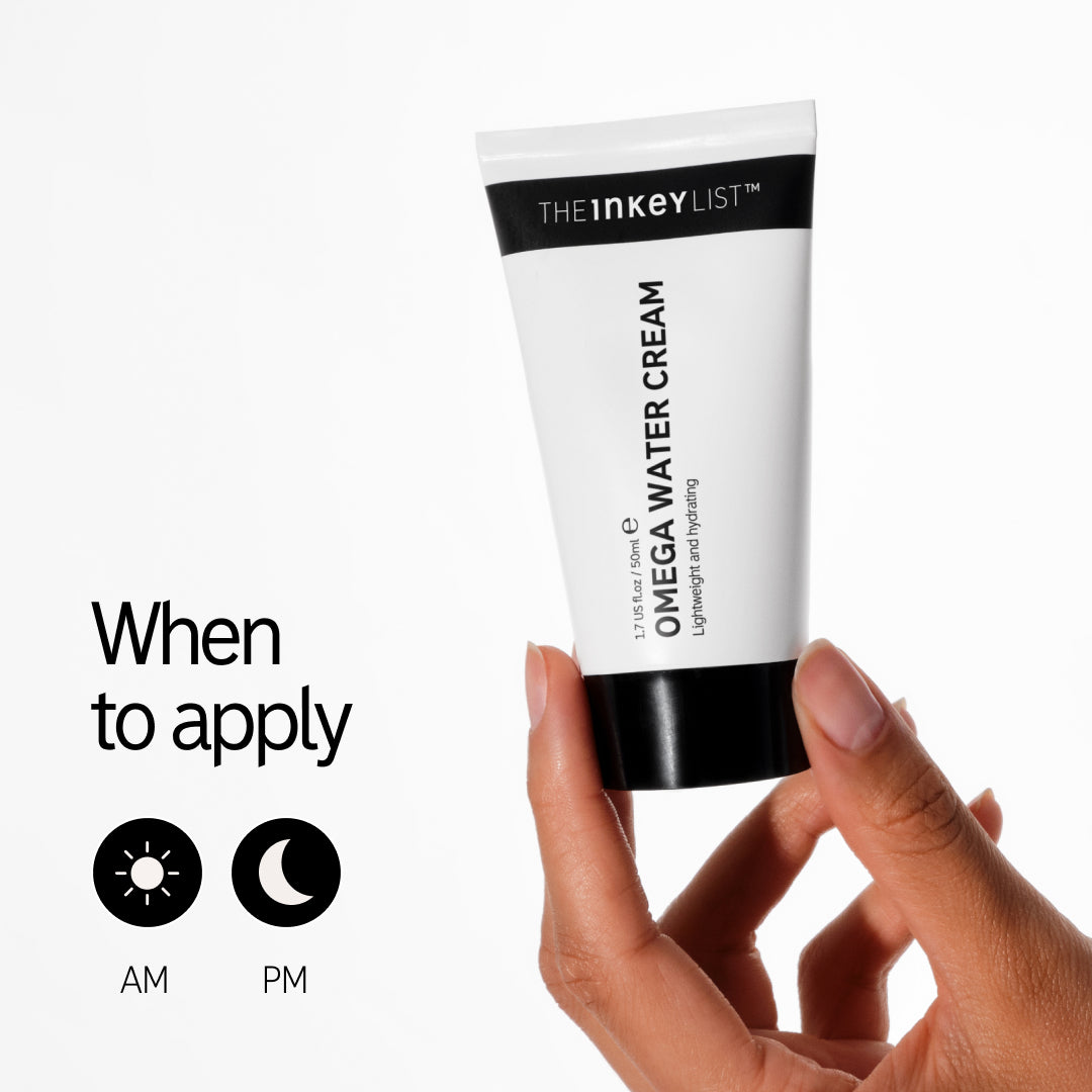 The INKEY List Omega Water Cream is a lightweight, water-based cream formulated to restore hydration, reinforce the skin barrier and help balance oil production. Clinically tested: users reported increased hydration, softer skin and more even tone with continued use.