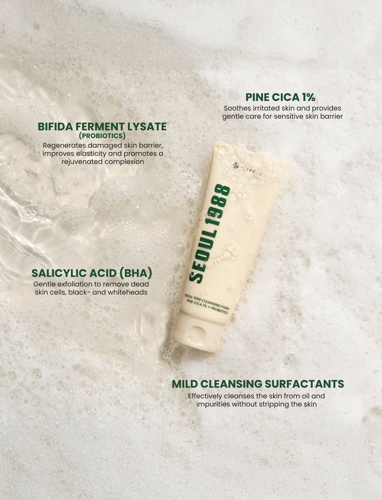 K-SECRET Seoul 1988 Cleansing Foam is a gentle, pH-balanced facial cleanser designed to effectively remove impurities, excess sebum, and makeup residues without stripping skin’s natural moisture. Enriched with 1% Pine Cica Complex and probiotics, it soothes irritated skin, strengthens the skin barrier, and promotes a healthy complexion. Salicylic acid helps exfoliate dead skin cells and unclog pores, making it suitable for acne-prone and sensitive skin.