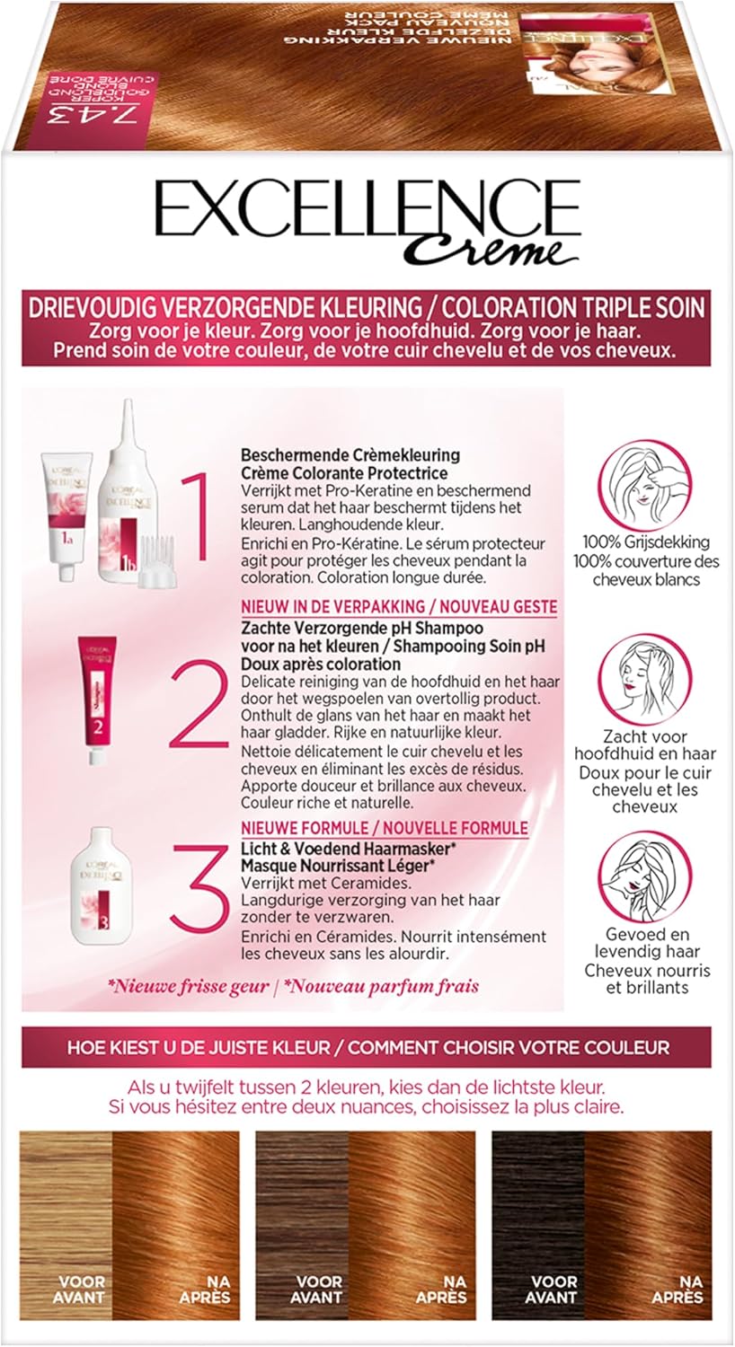 L’Oréal Paris Excellence Crème 7.43 Copper Golden Blonde is a premium permanent hair dye designed to deliver vibrant, long-lasting color while taking care of your hair’s health. Its advanced triple care formula contains Depth Protection Serum, Pro-Keratin, and Ceramide to strengthen, protect, and rebuild hair fibers during coloring. The result is 100% gray coverage with shiny, smooth, and healthy-looking hair.