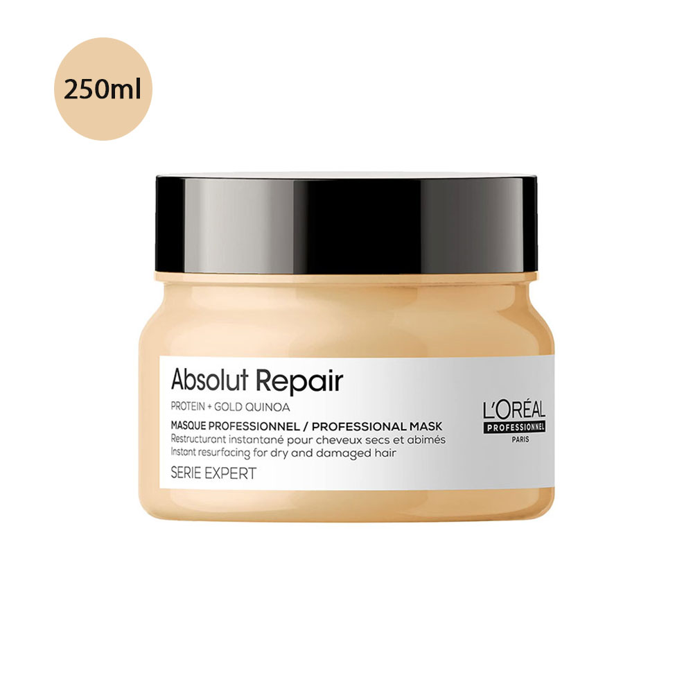 L’Oréal Absolut Repair Hair Mask 250ml deeply nourishes and repairs damaged hair with Gold Quinoa and Protein. It strengthens, softens, and smooths strands for shiny, healthy, salon-quality results.