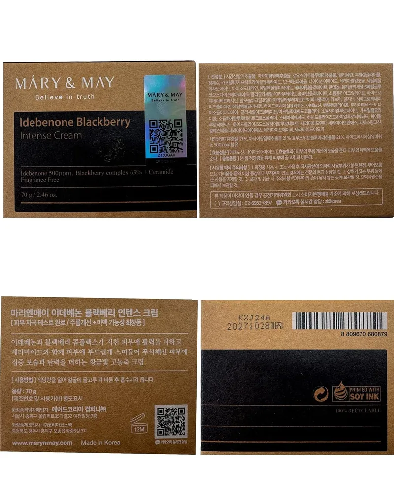 Mary & May Idebenone + Blackberry Complex Intensive Total Care Cream 70g brightens, firms, and hydrates with potent antioxidants. This rich K-Beauty moisturizer reduces fine lines and restores youthful radiance for smooth, glowing skin.