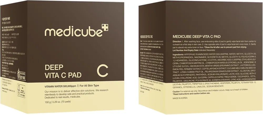 Medicube Deep Vita C Pad brightens dull skin, smooths texture, and fades dark spots with Vitamin C and Niacinamide. Dual-textured pads gently exfoliate and hydrate for soft, radiant, and even-toned skin.