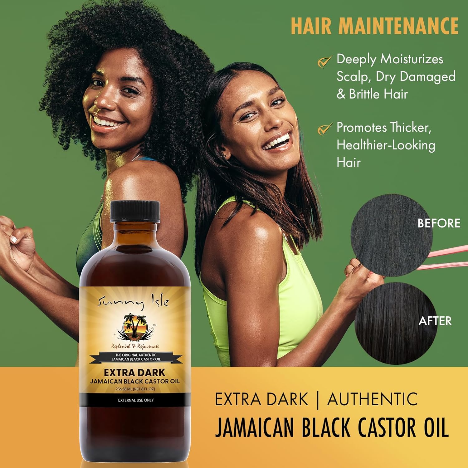 - Sunny Isle Extra Dark Jamaican Black Castor Oil (JBCO) – Rich in omega-9 fatty acids and vitamin E, this oil promotes hair growth, strengthens roots, and moisturizes dry scalp.