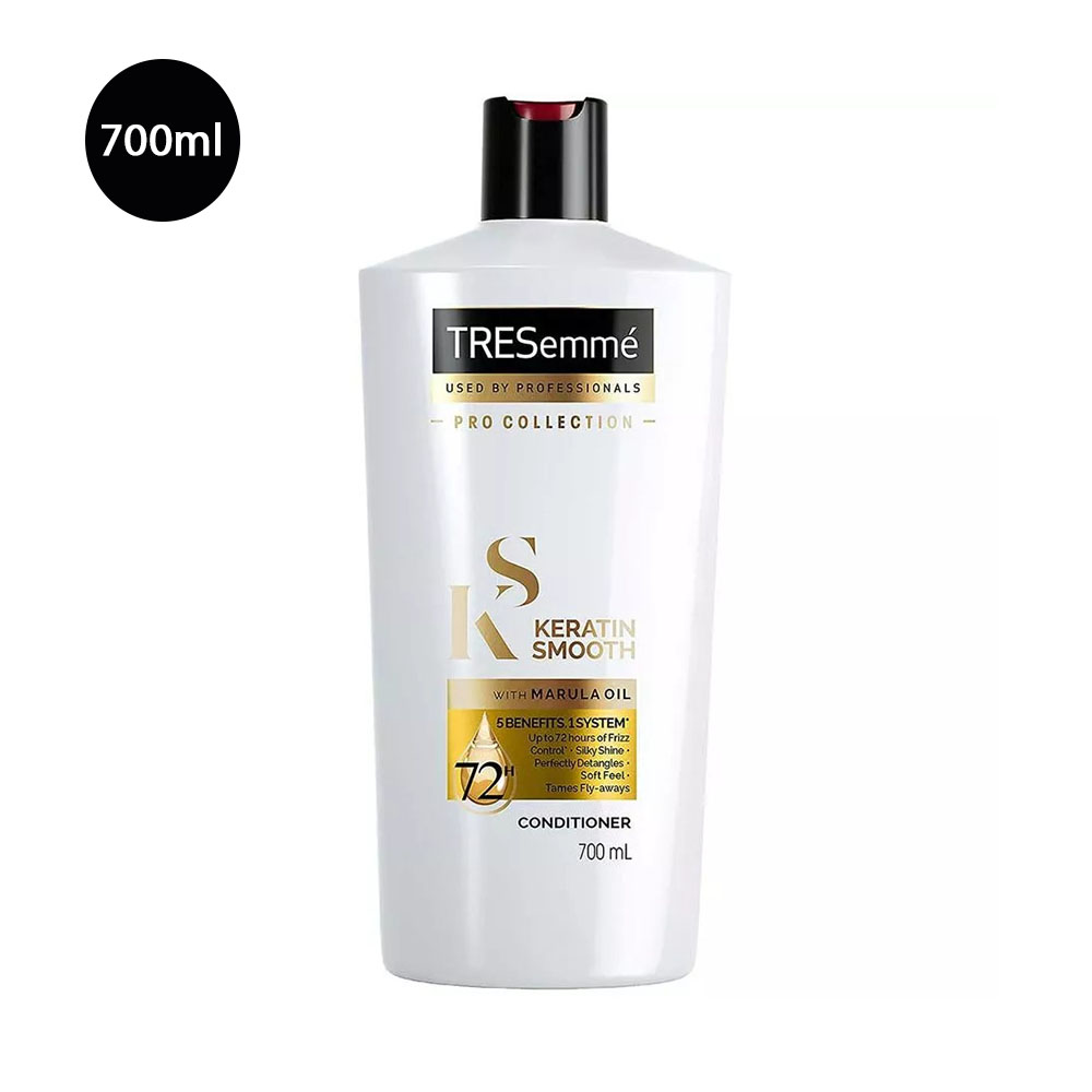 TRESemmé Keratin Smooth Conditioner 700ml softens, detangles, and controls frizz with Keratin and Argan Oil. It hydrates deeply, boosts shine, and leaves hair sleek, smooth, and easy to manage.