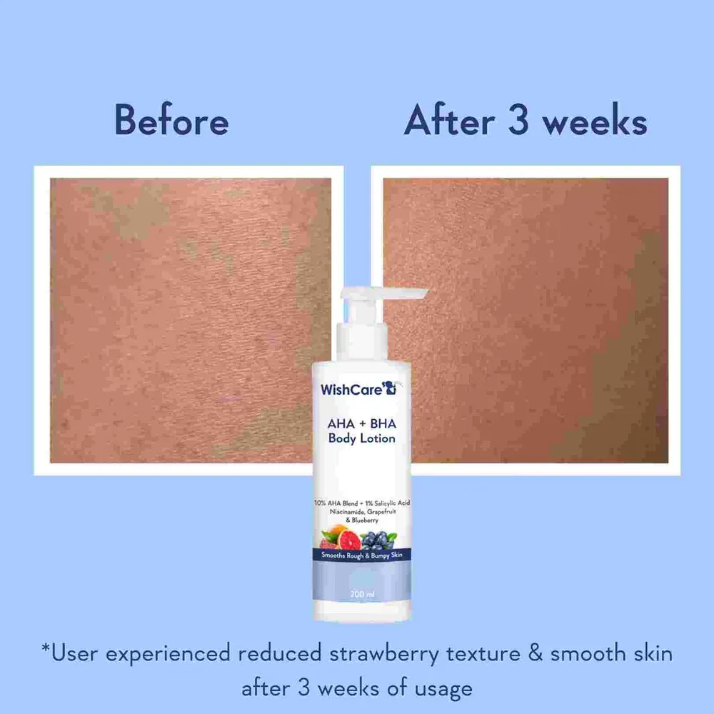 WishCare AHA + BHA Body Lotion (200 ml) exfoliates, smooths, and brightens with 8% AHAs + 2% BHA. It targets body acne, rough texture, dark patches, and strawberry legs, giving clear, soft, and glowing skin every day.